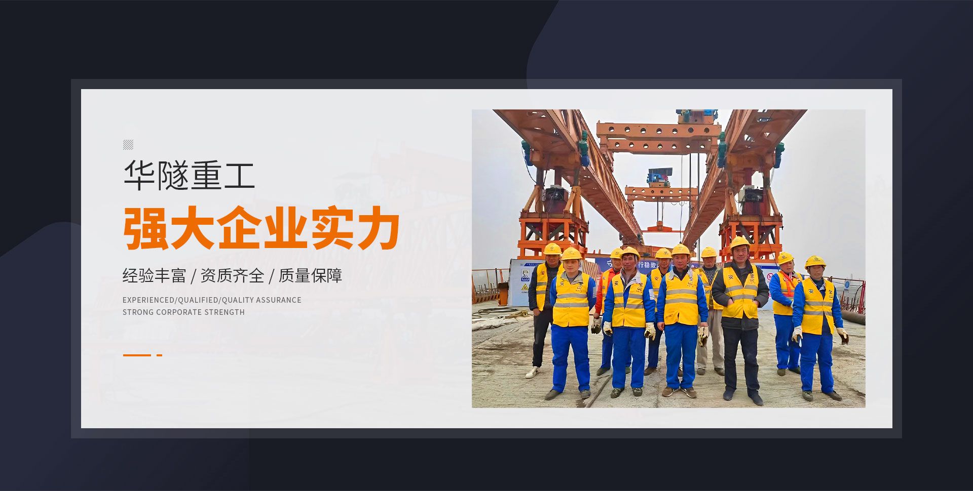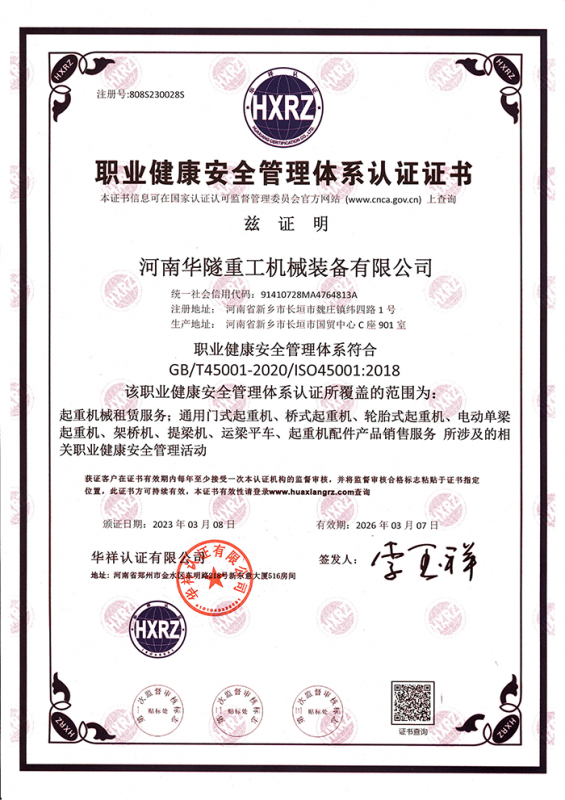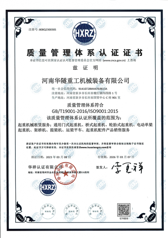 河南華隧重工機(jī)械裝備有限公司主要從事通用門式起重機(jī)、橋式起重機(jī)、電動(dòng)單梁起重機(jī),輪胎式起重機(jī)、架橋機(jī)、提梁機(jī)、遠(yuǎn)梁平車、鋼絲繩電動(dòng)萌蘆、卷?yè)P(yáng)機(jī)、起重配件制造、銷售:起重機(jī)械租賃、安裝和維修,起重設(shè)備園收,機(jī)械設(shè)備維修,鋼結(jié)構(gòu)工程承包,橋梁工程及技術(shù)咨淘服務(wù),銷售五金制品、機(jī)電設(shè)備:建設(shè)工程監(jiān)理,建設(shè)工程設(shè)計(jì),各類工程建設(shè)活動(dòng),建筑勞務(wù)分包,建筑物折除作業(yè),施工作業(yè),工程管理服務(wù),土石方工程施工,裝如發(fā)運(yùn)。  公司已通過IS0國(guó)際質(zhì)量、環(huán)境、健康與安全三合一標(biāo)準(zhǔn)認(rèn)證,特種設(shè)備制造許可證和特種設(shè)備安裝改造維修許可證。擁有完熟的質(zhì)量管理體系。嚴(yán)格的管理制度,強(qiáng)大的生產(chǎn)能力和先進(jìn)的檢測(cè)手段,在保證產(chǎn)品質(zhì)量的同時(shí),也具備了極強(qiáng)的市場(chǎng)競(jìng)爭(zhēng)力。  公司堅(jiān)持科技創(chuàng)新為理念,產(chǎn)品質(zhì)量為核心,注重信譽(yù),建立了減信可靠、快捷、思速。便利周到的售后服務(wù)網(wǎng)絡(luò)。  我們擁有的技術(shù)專家和技術(shù)服務(wù)隊(duì)伍為客戶提供充善的售前技術(shù)支持和全天候的售后服務(wù)體系,讓您無后顧之憂,享受一站式的超值服務(wù)。  “華隧重工,伴您成功“是華隧重工永遠(yuǎn)的宗指,真被的希望與各界朋友攜手并進(jìn)。共創(chuàng)輝準(zhǔn)!